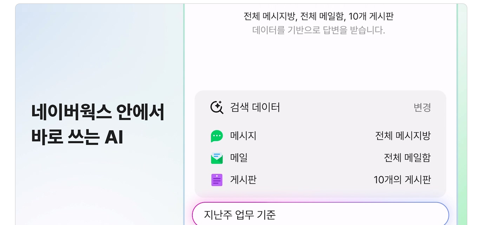 웹 정보는 물론, 게시판·메시지·드라이브에 쌓인 사내 데이터를 함께 탐색하여 업무의 맥락을 이해한 정확하고 신뢰도 높은 답변을 제공합니다.
